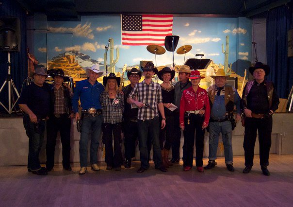 It’s a total institution. Most of the regulars seem to have been going there for years and usually we are by far the youngest people in the place. When we first started going, we were worried that, because we weren’t regulars, we wouldn’t be welcome, or that we might accidentally come across as disrespectful in our charity shop cowboy boots and denim shirts. That absolutely is not the case. The photo above is from a few years ago now. Richy, Hazel and I have birthdays close to each other, so we had a big collective night out. In this picture, we’ve just been given birthday cards and they let us pose with the gunslingers (more on that in a minute). One of them even let Richy hold his gun!!