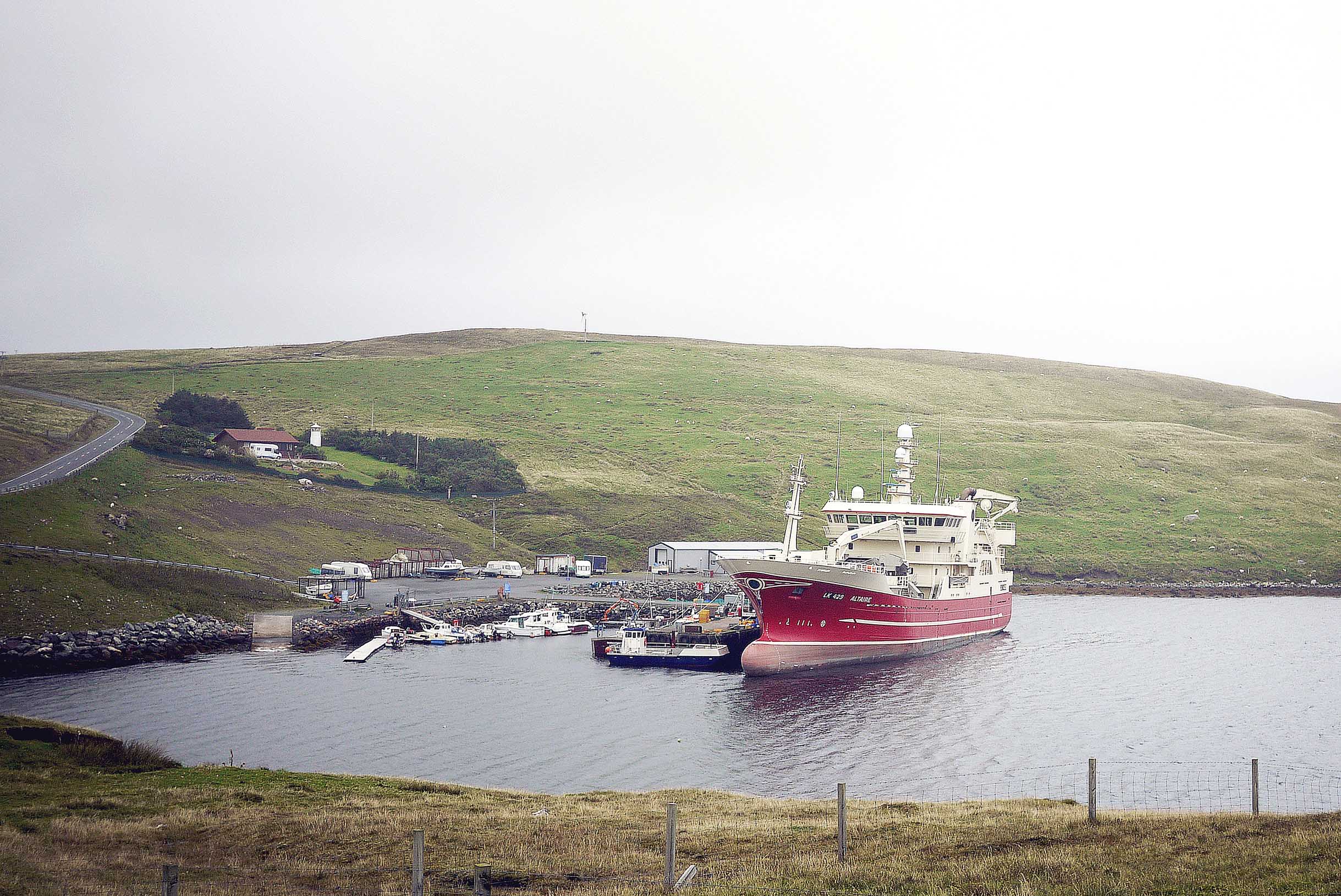 On the way home we stopped to have a look at the Altaire at Collafirth Pier. The Altaire is an enormous pelagic trawler, one of the largest in the Scottish fleet. It dwarves the pier and surrounding area, and I reckon, is about 10 times the size of the old sixareens that would have been used for the Haaf. And probably manned with the same number of crew.